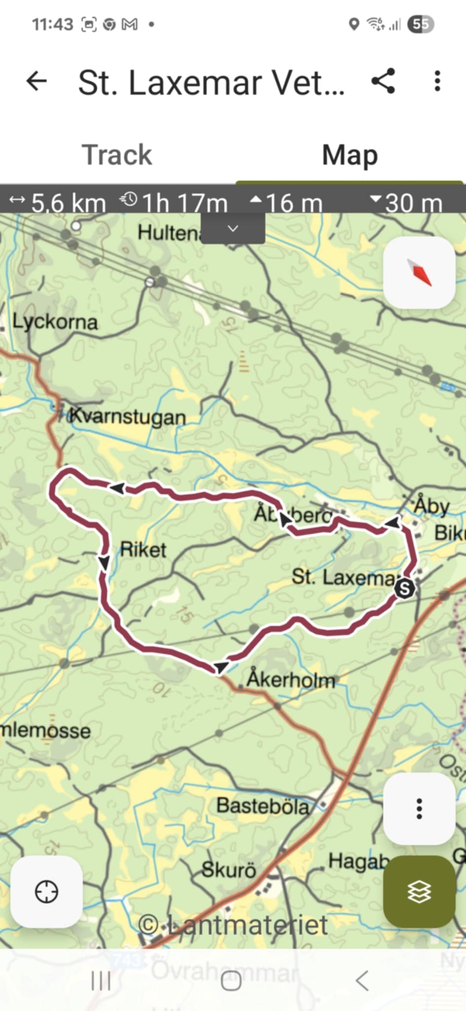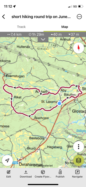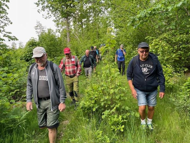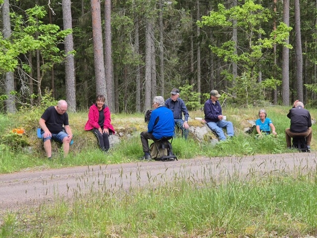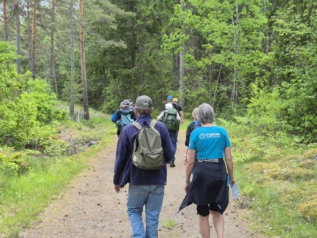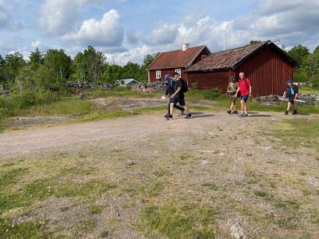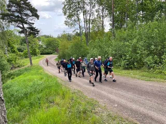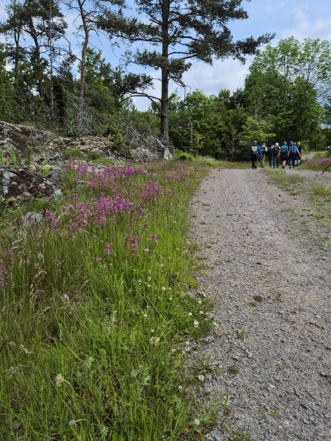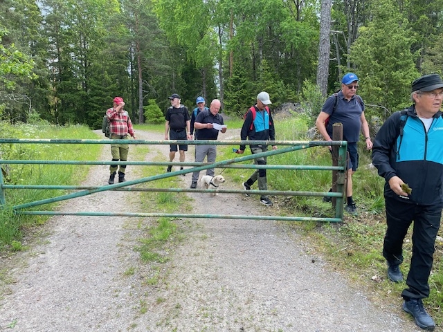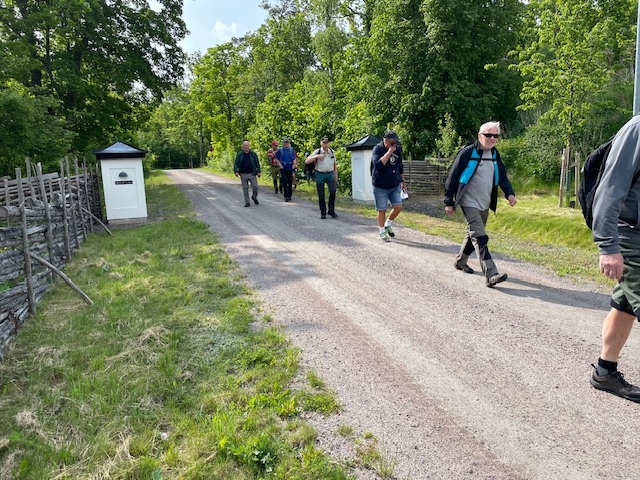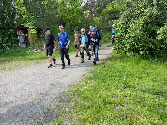 Sommarvandring från St Laxemar via Ström och Riket. Växlande molninghet, behgligt varmt cirka 20 grader. 11 vandrare gick 5,6 km på korta och 17 man 7,4 km på långa.