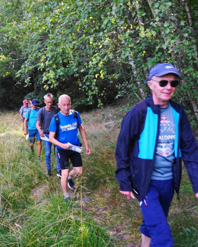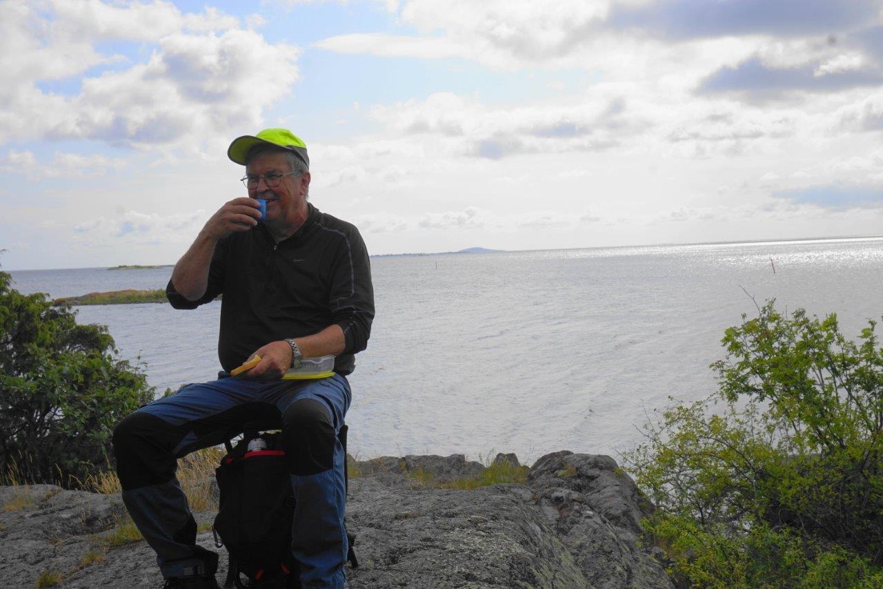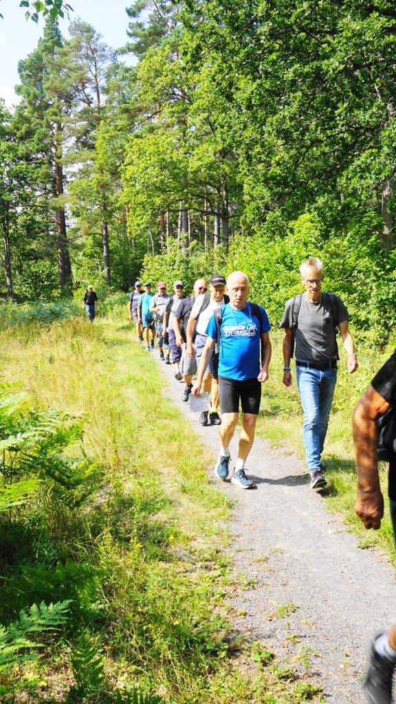 Höstupptakt för veteranvandringarna från Saltvik till Uvö på lite olika vägar, 3 man på korta 4,9 km, 13 på långa 9 km. Solig sommardag med cirka 20 grader. En ny vandrare, Lennart Johansson.