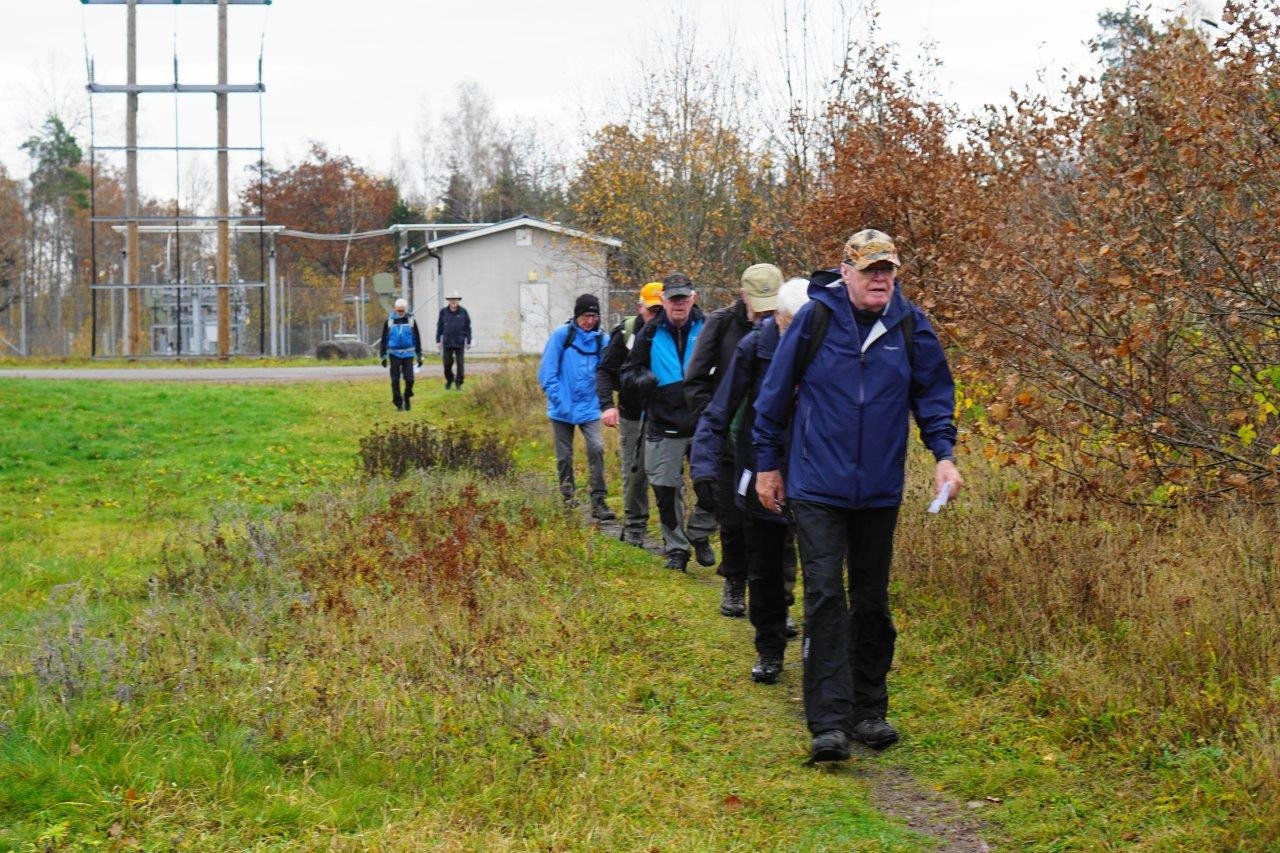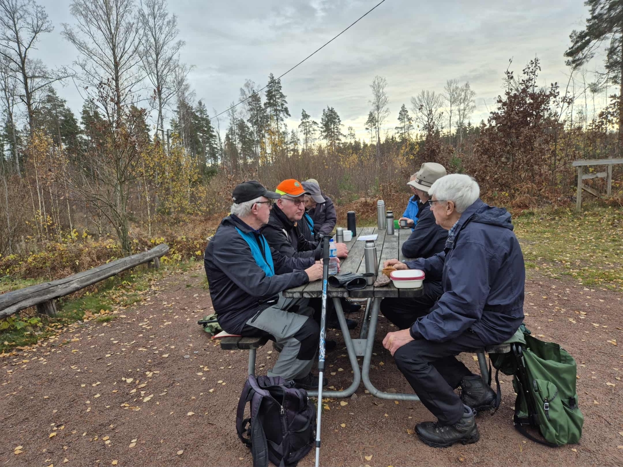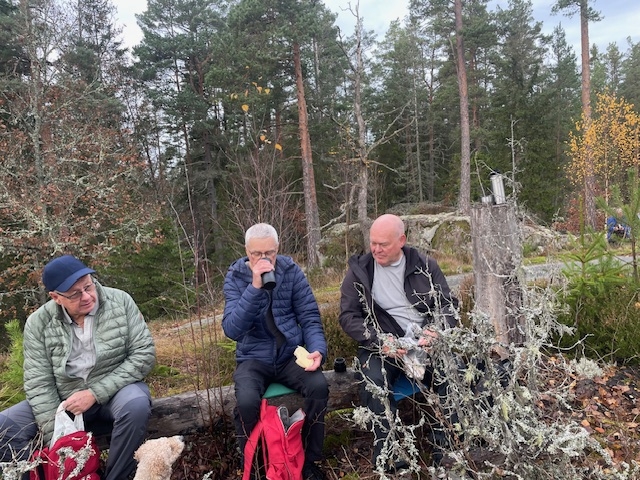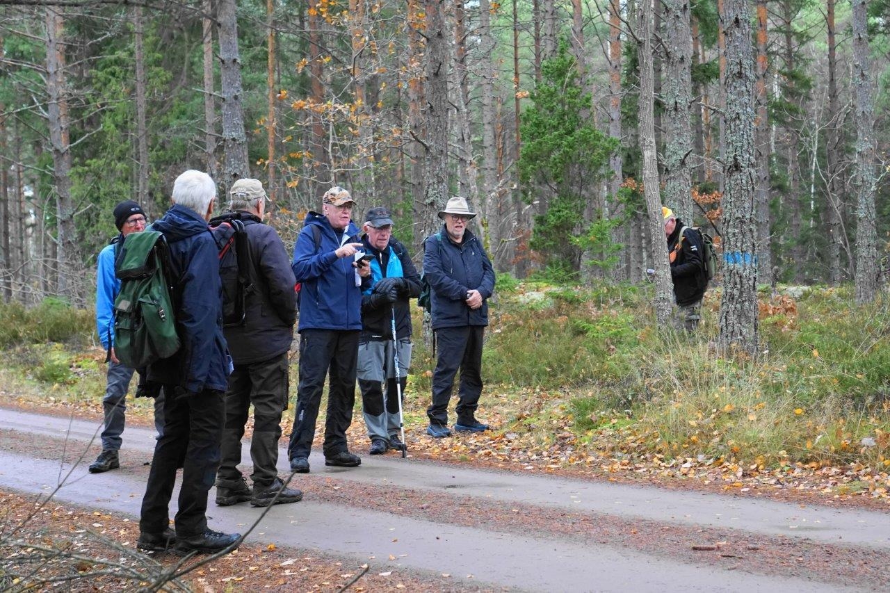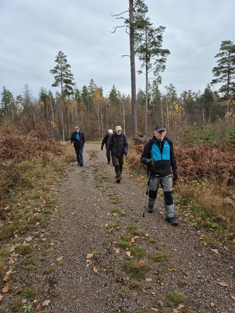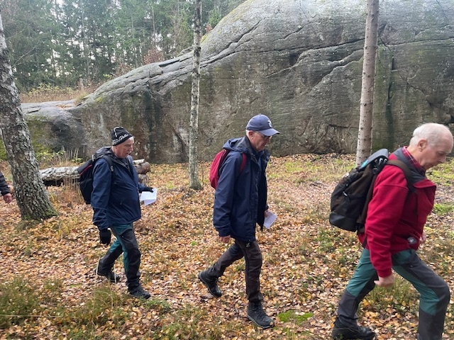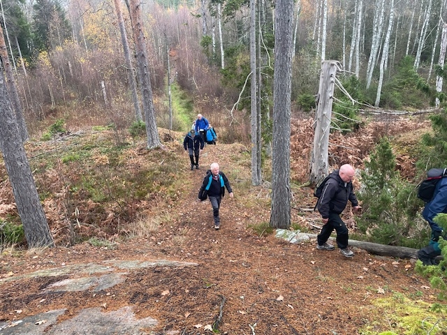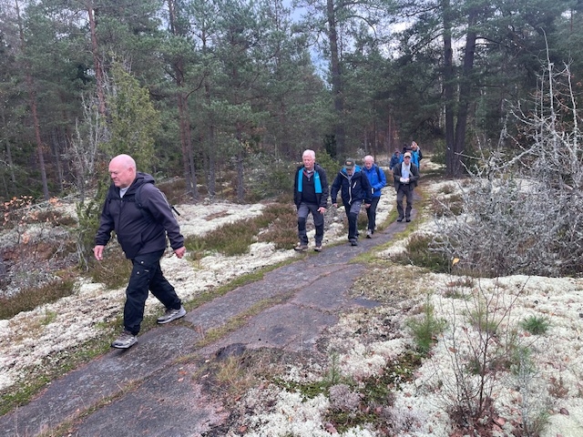 Gråmulen och fuktig dag, 12 grader och ett fåtal regnstänk. Vandring i Långehälls friluftsområde i Blomstermåla på MTB-stigar och lite hala berghällar. 17 man på långa 8 km och 9 på korta 4,6 km. En ny vandrare Stefan Windh.