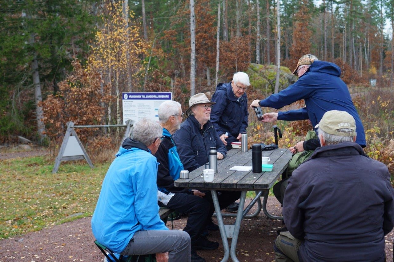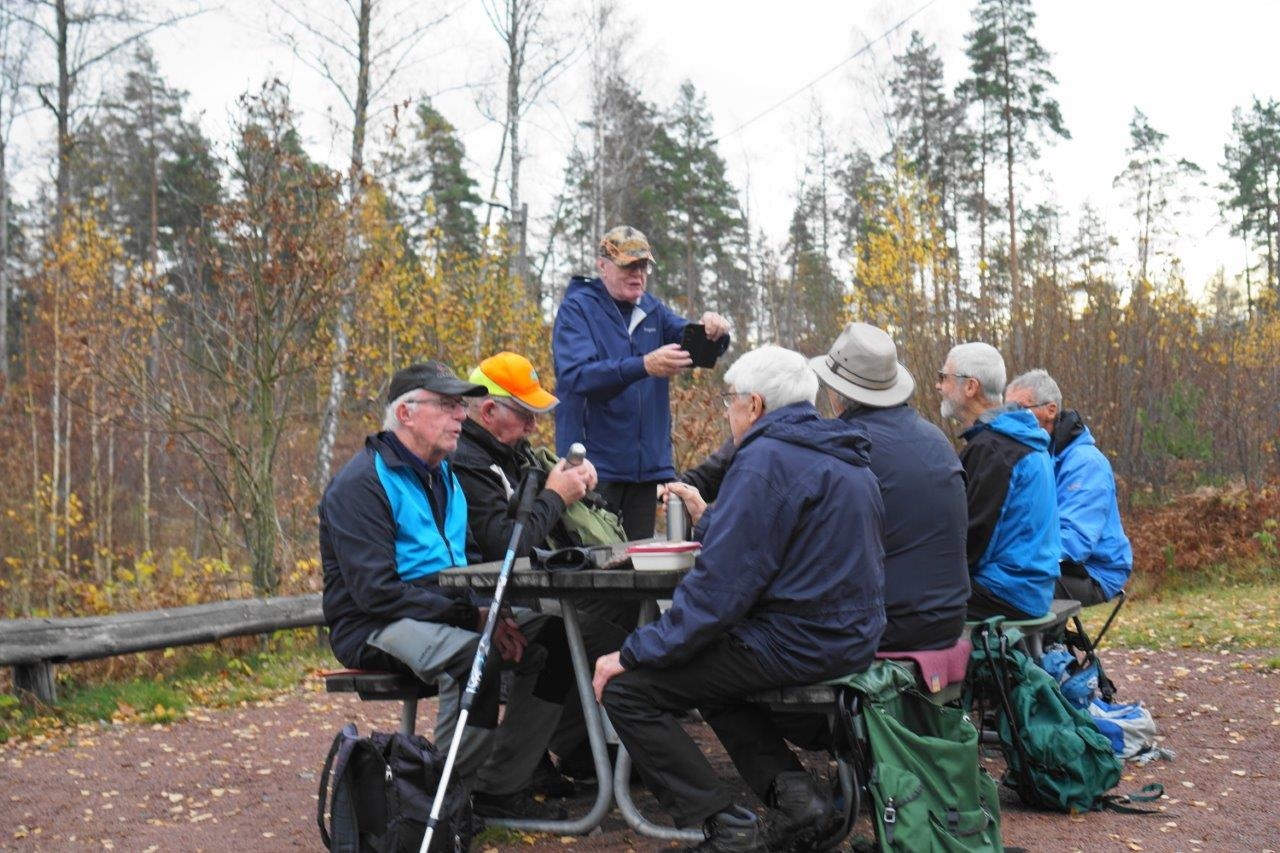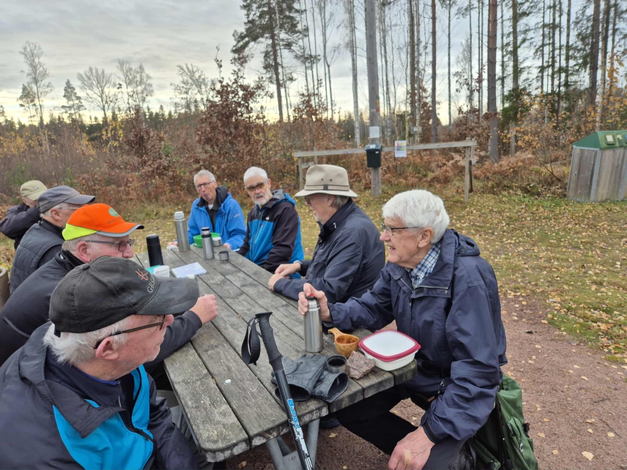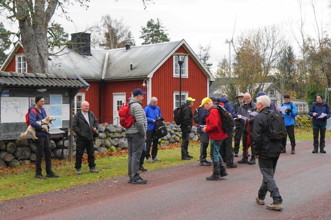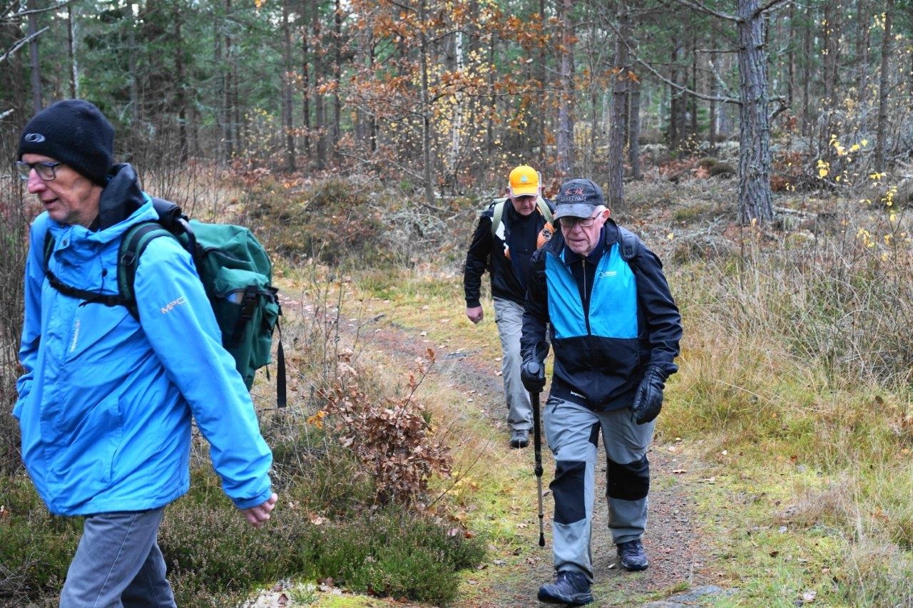 Gråmulen och fuktig dag, 12 grader och ett fåtal regnstänk. Vandring i Långehälls friluftsområde i Blomstermåla på MTB-stigar och lite hala berghällar. 17 man på långa 8 km och 9 på korta 4,6 km. En ny vandrare Stefan Windh.