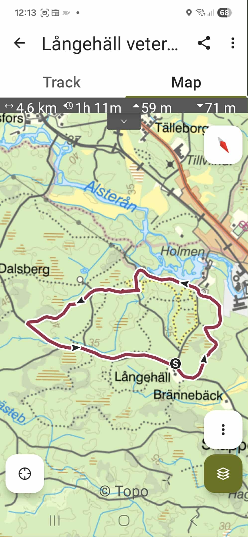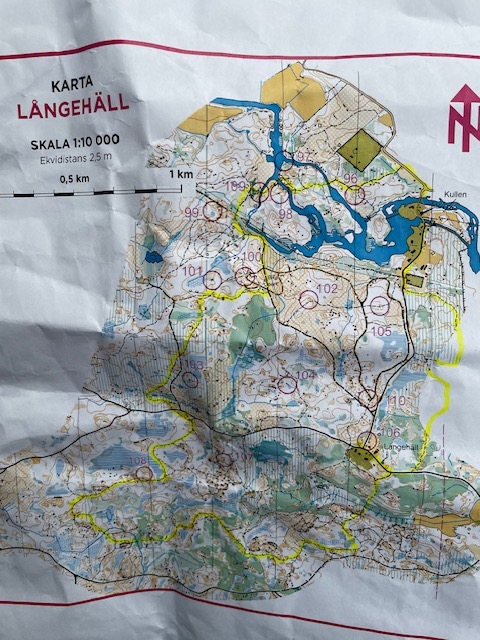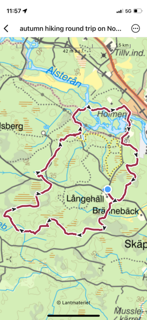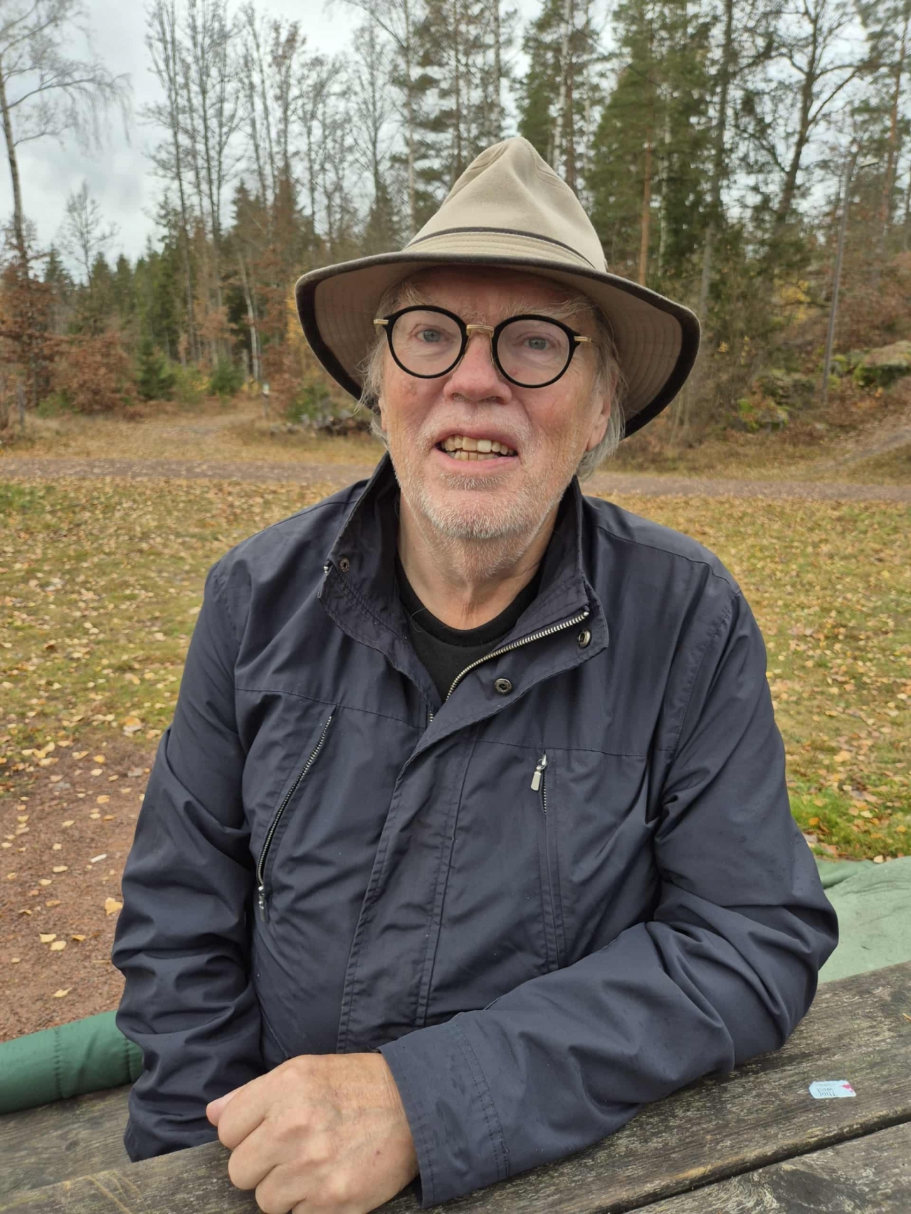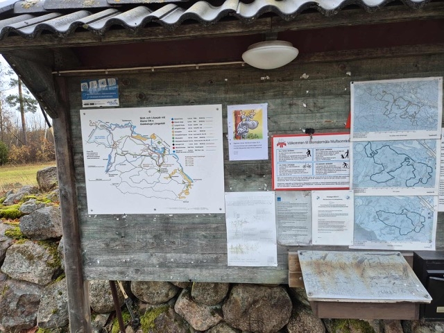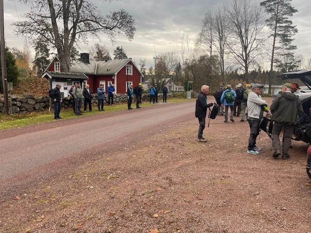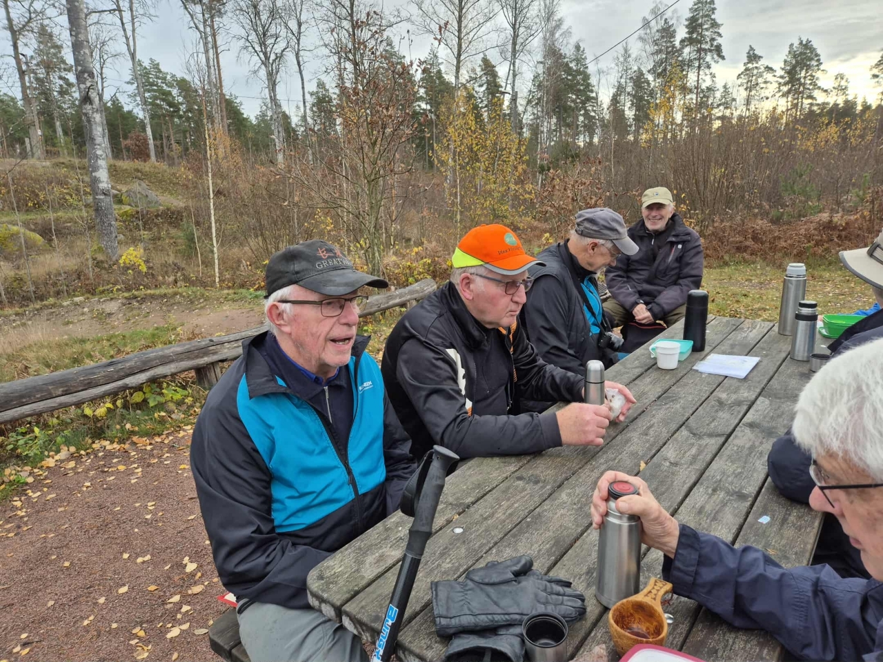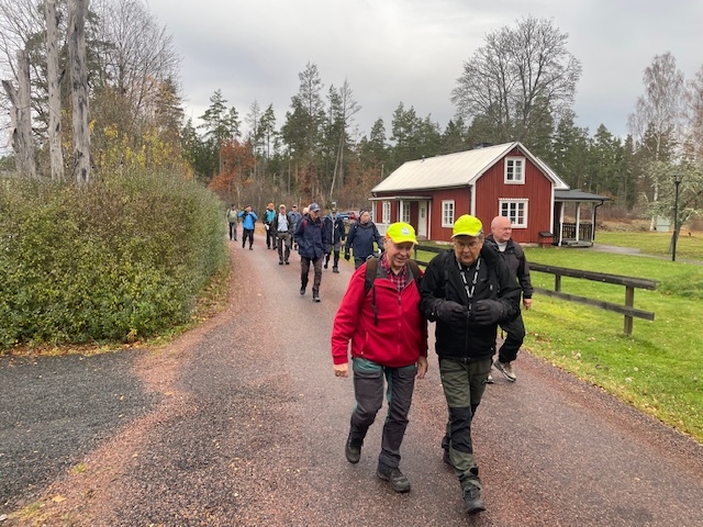Gråmulen och fuktig dag, 12 grader och ett fåtal regnstänk. Vandring i Långehälls friluftsområde i Blomstermåla på MTB-stigar och lite hala berghällar. 17 man på långa 8 km och 9 på korta 4,6 km. En ny vandrare Stefan Windh.