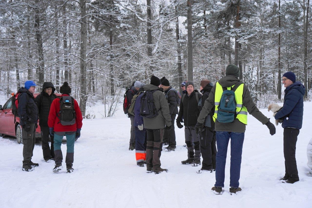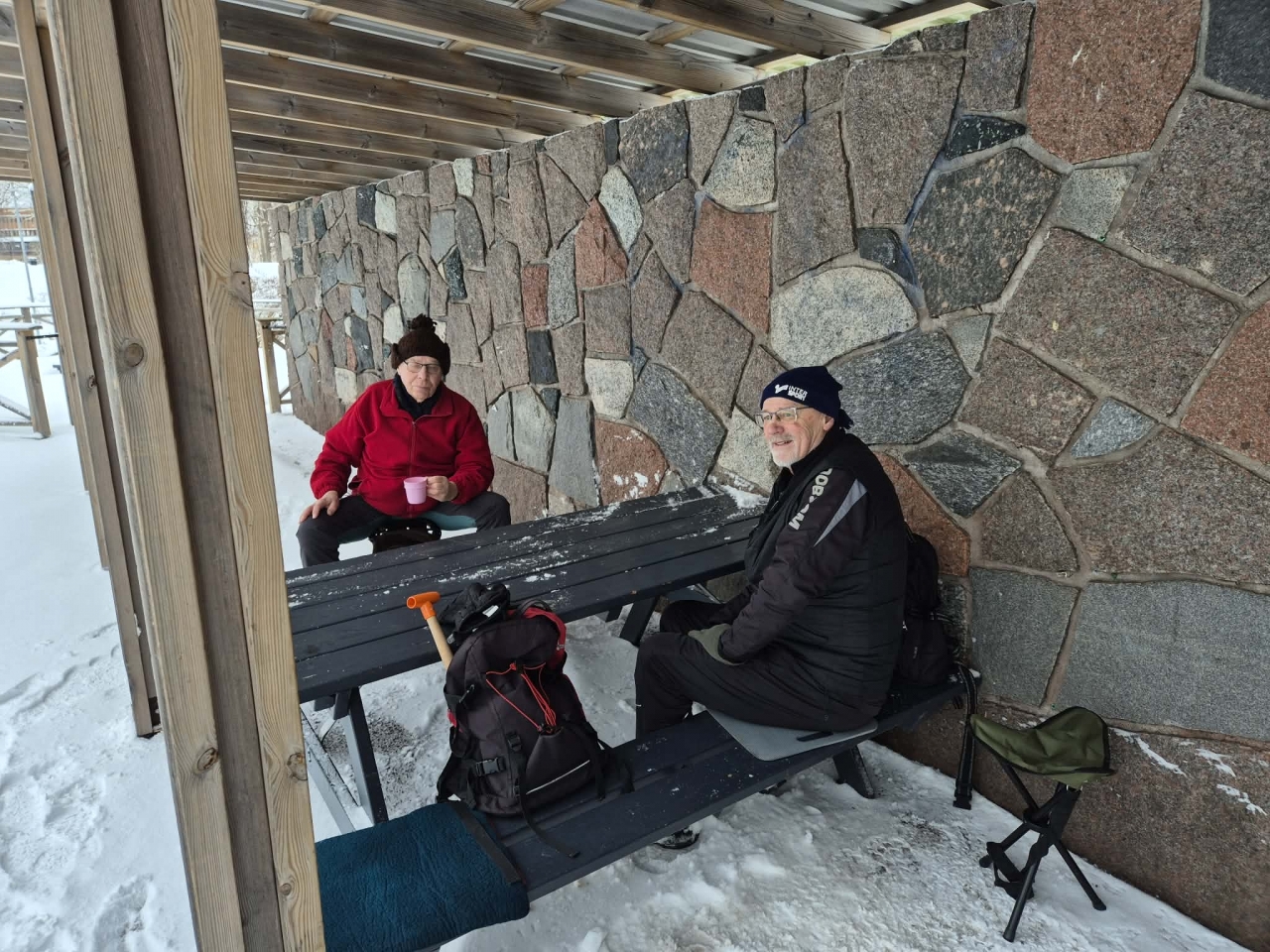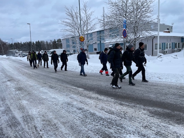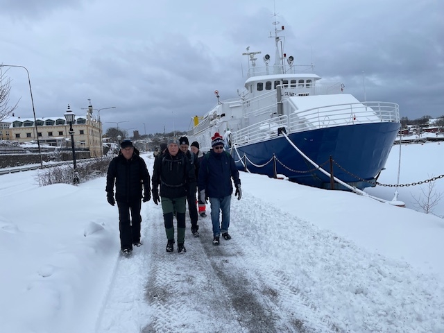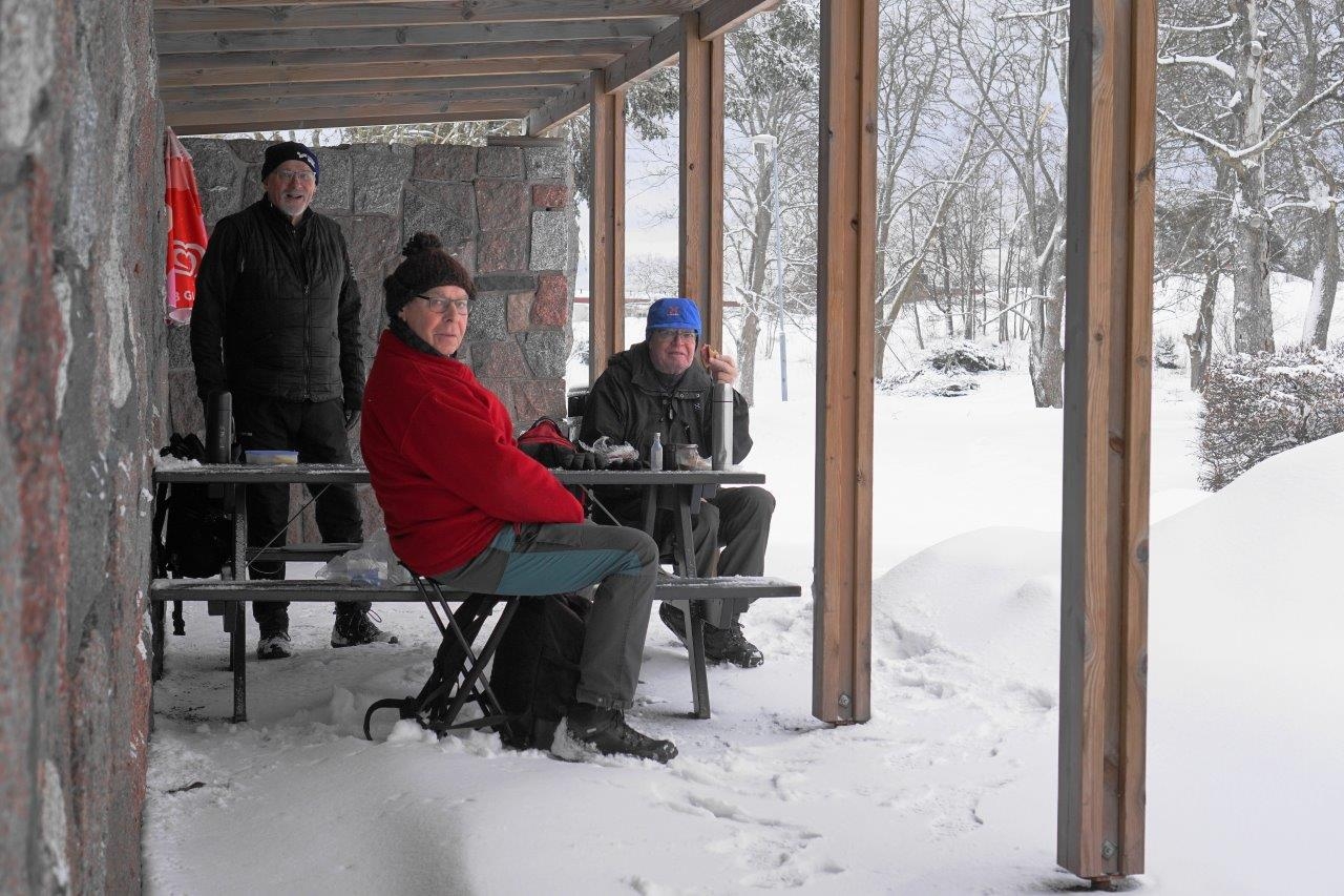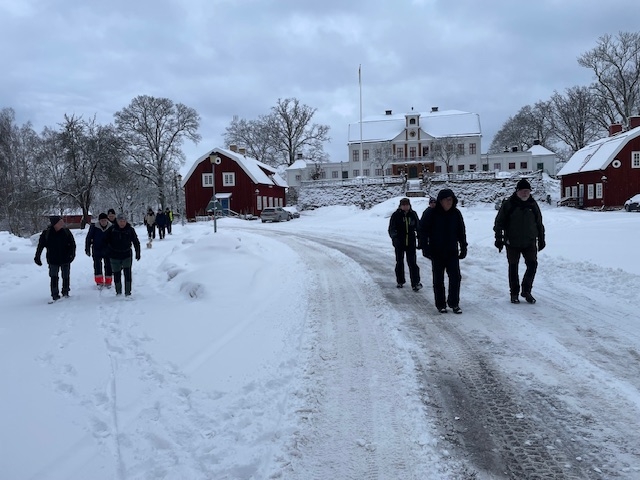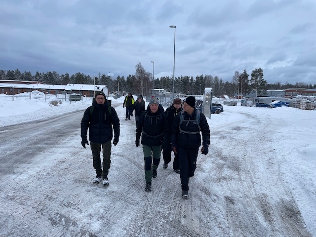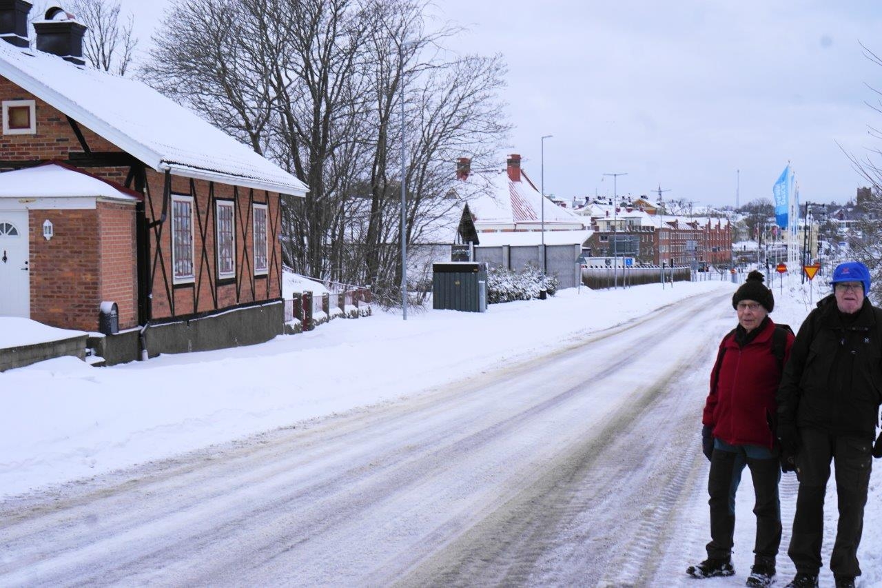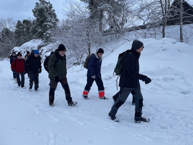 Vandring från Kristineberg via Fredriksberg och hamnen. Mulet och någon minusgrad, bitvis lite moddigt på oplogade gångbanor. Långa med 13 man gick 9,3 km och korta 6,4 med 3 man.