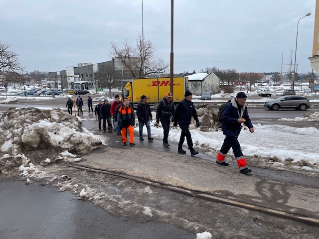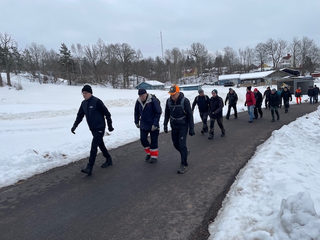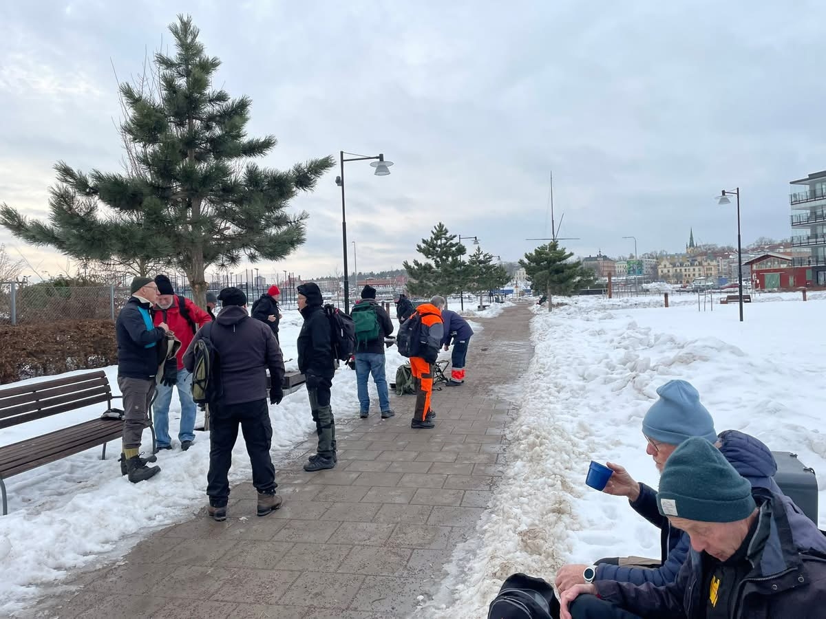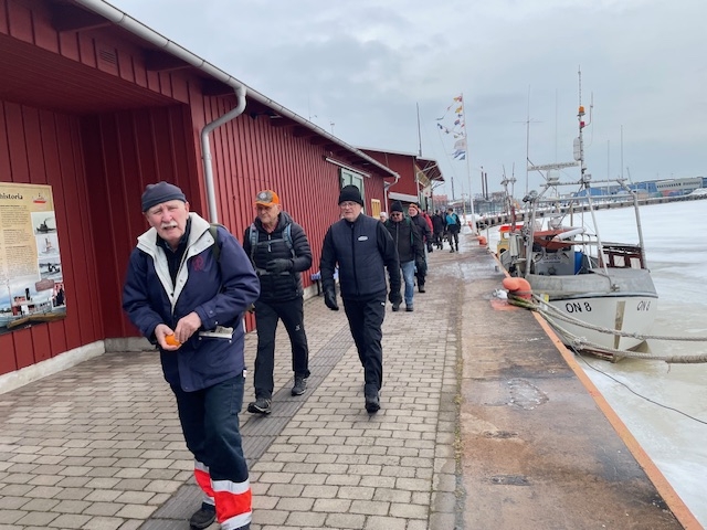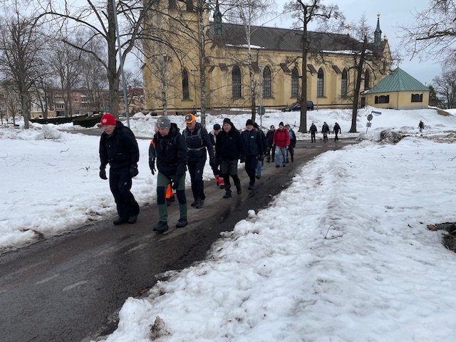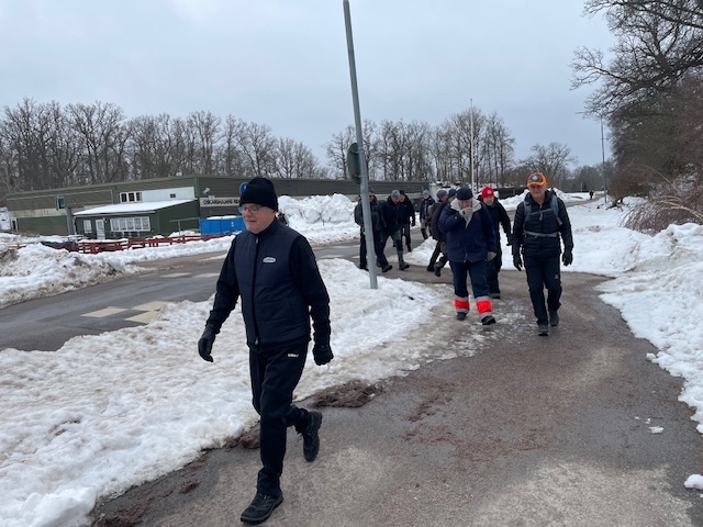 Fortfarande mycket snö i skogen och därmed vandring på gator och vägar. Från Hjortberget via Kilen, Humlekärrshult och Stadsparken. Mulet och grått, några få plusgrader. 19 man på långa som blev 8,4 km och 6 på korta 5,4 km.