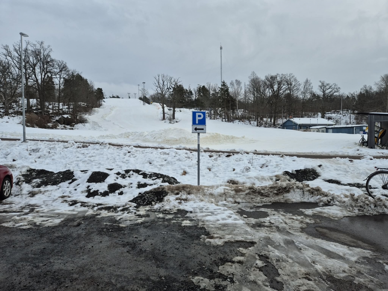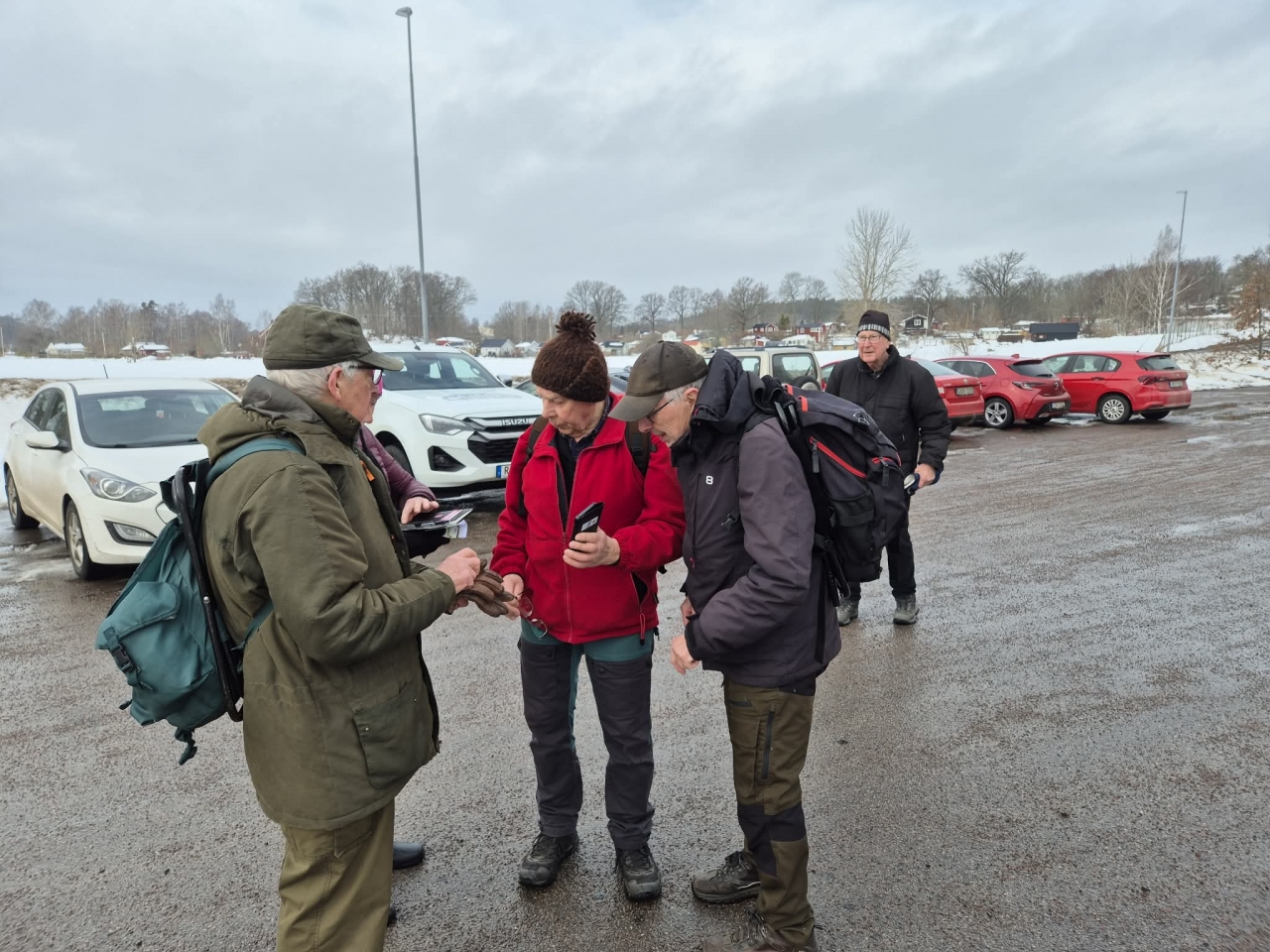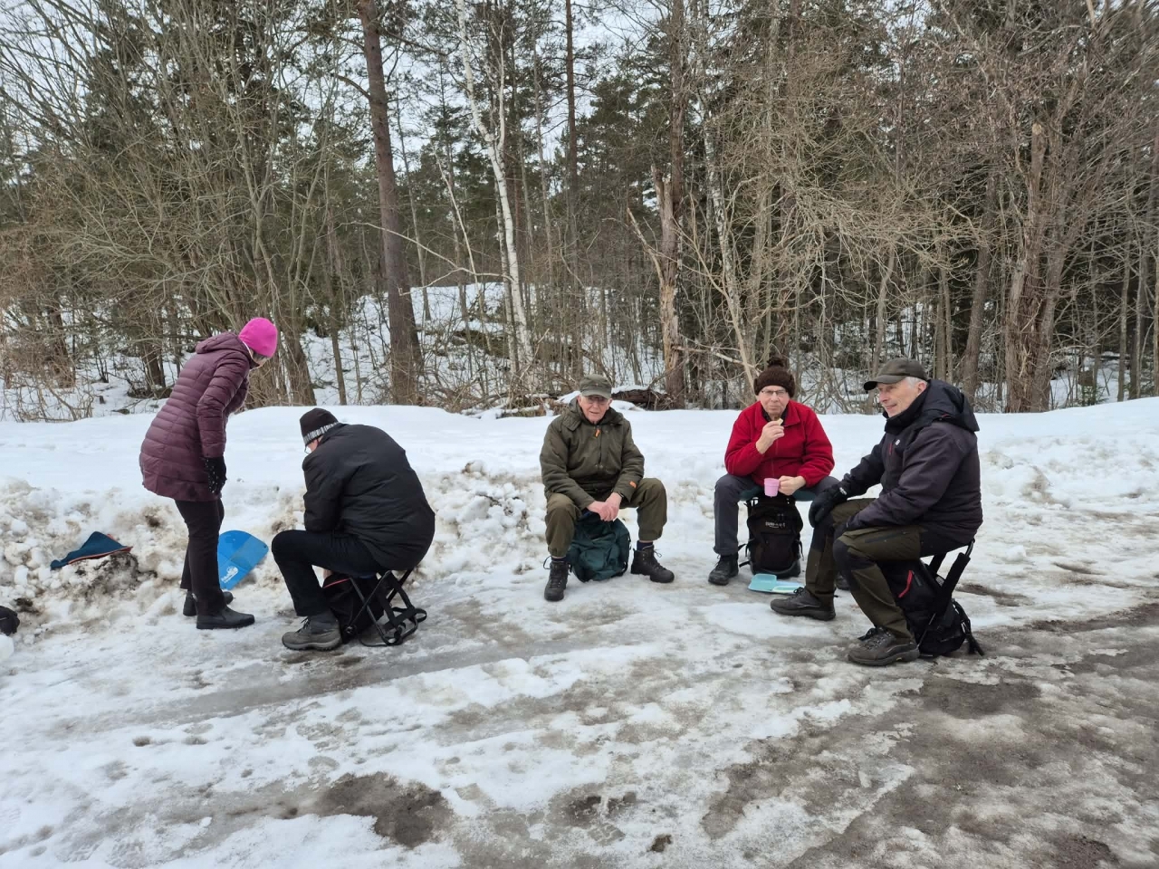 Fortfarande mycket snö i skogen och därmed vandring på gator och vägar. Från Hjortberget via Kilen, Humlekärrshult och Stadsparken. Mulet och grått, några få plusgrader. 19 man på långa som blev 8,4 km och 6 på korta 5,4 km.