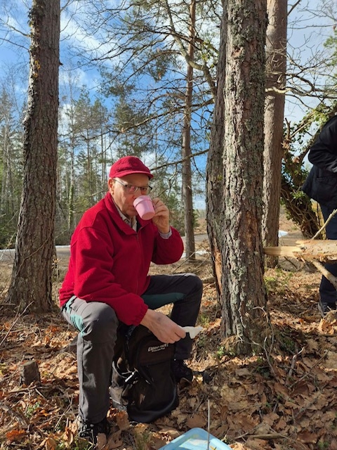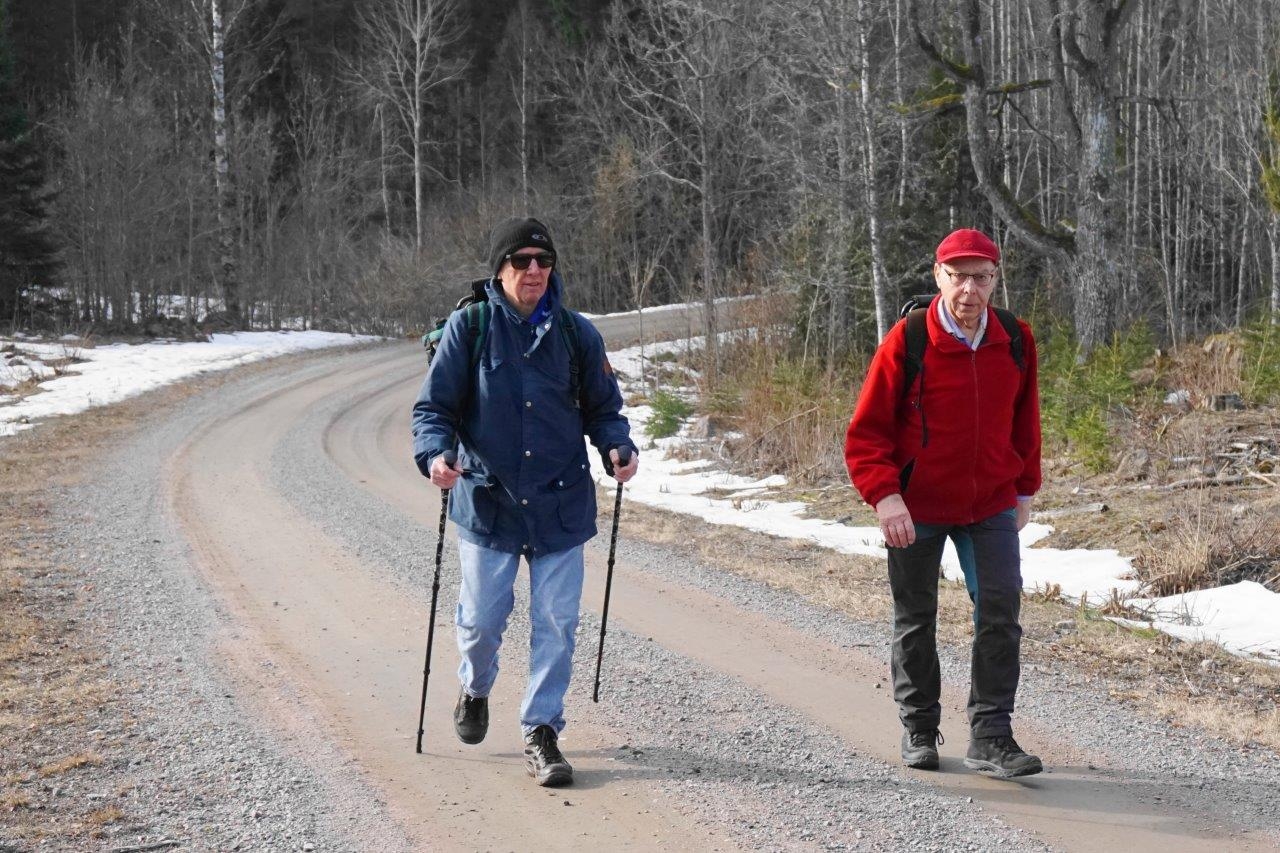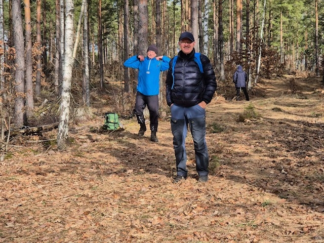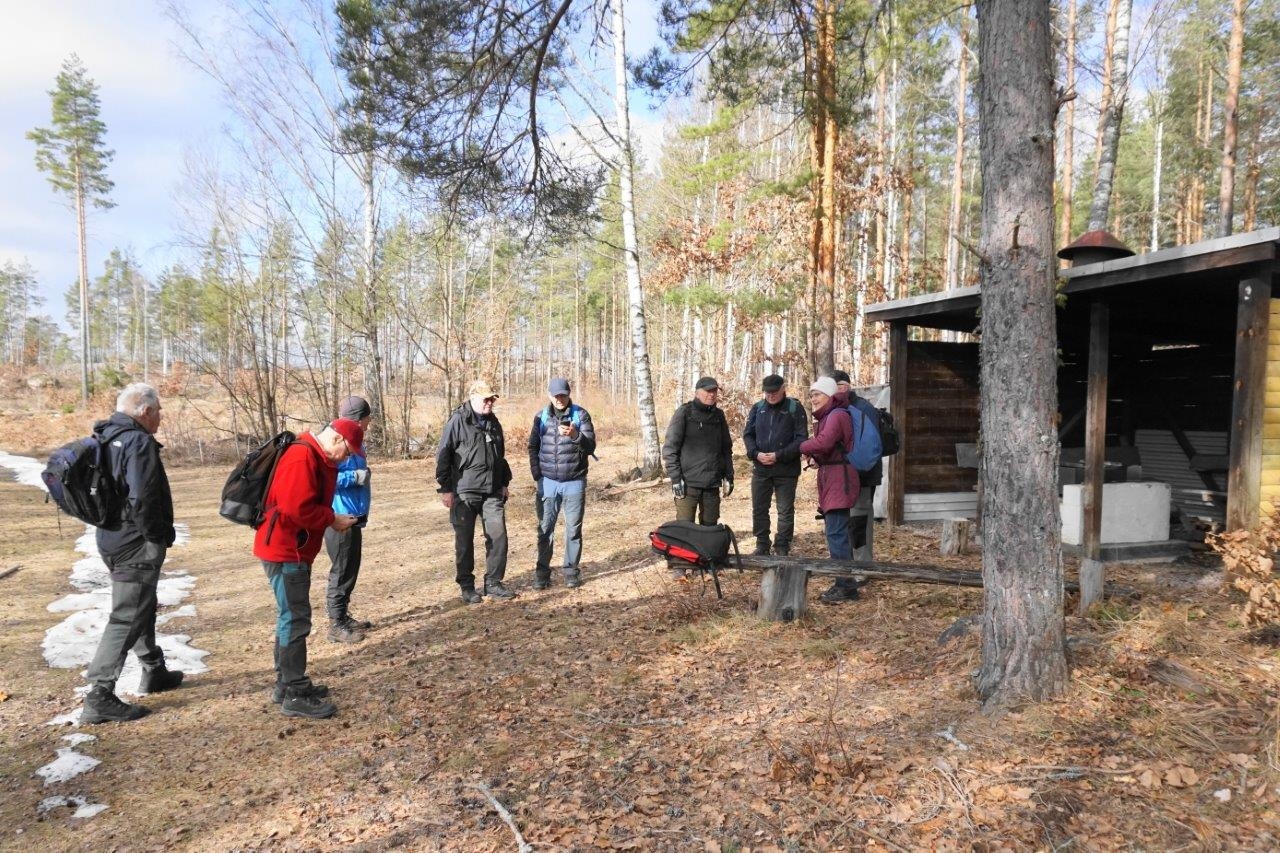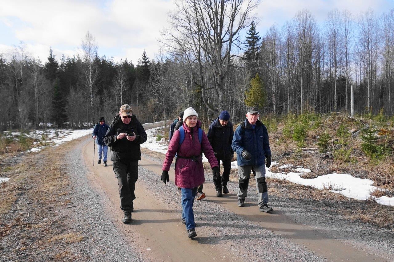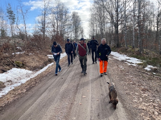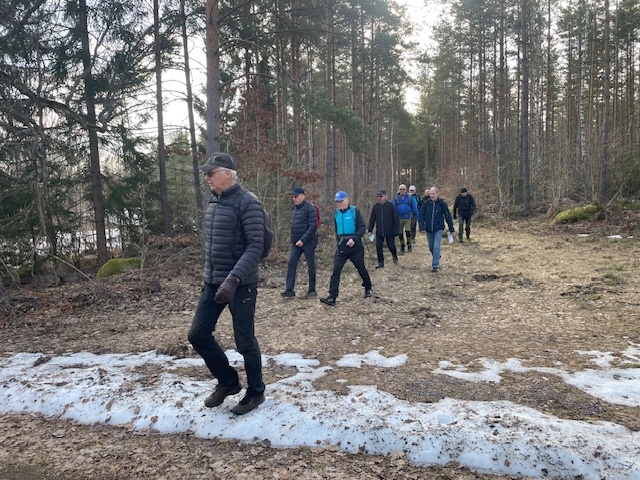 Vandring från Stora Hällesjön via Sälleryd, Isgölen och Möckhult. Soligt och 10 grader men lite kylig vind. 13 man på långa 8,6 km och 12 på korta 6,8 km (nytt längdrekord).