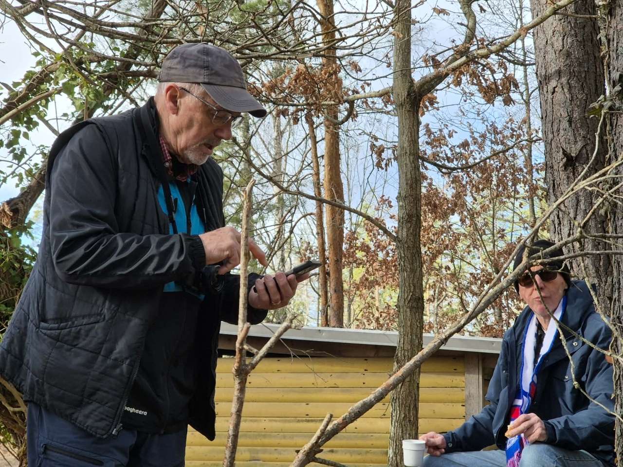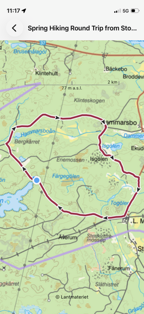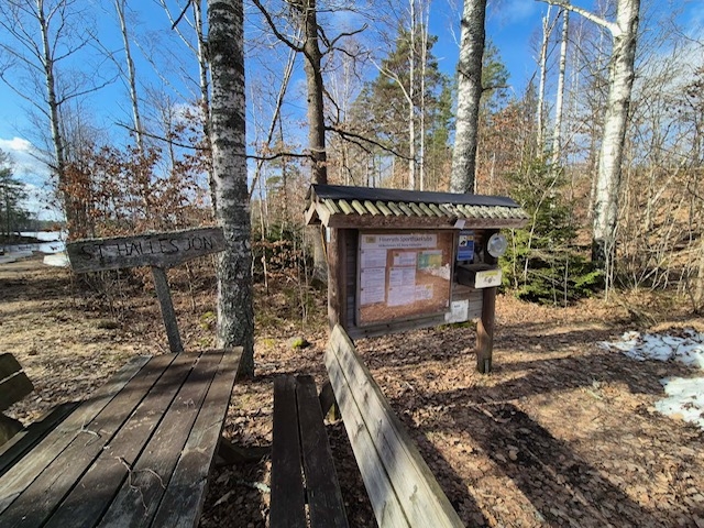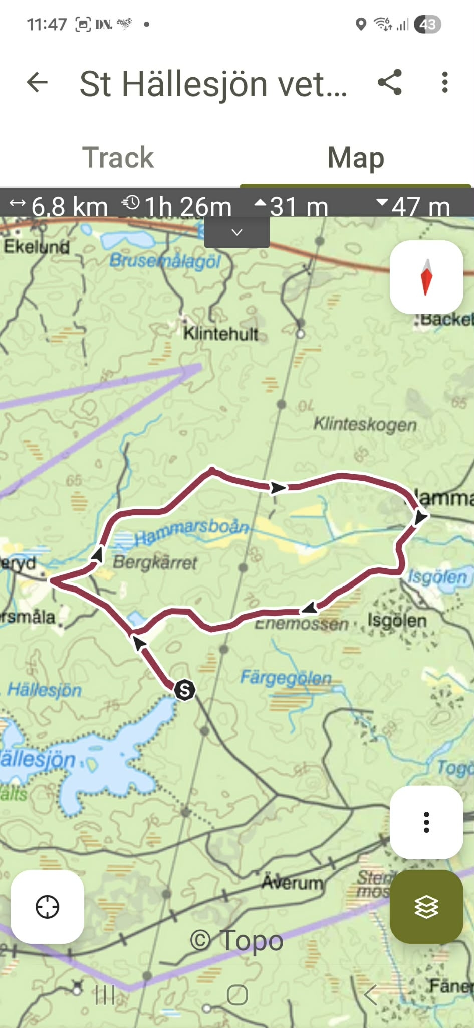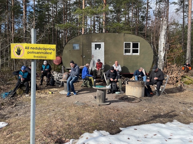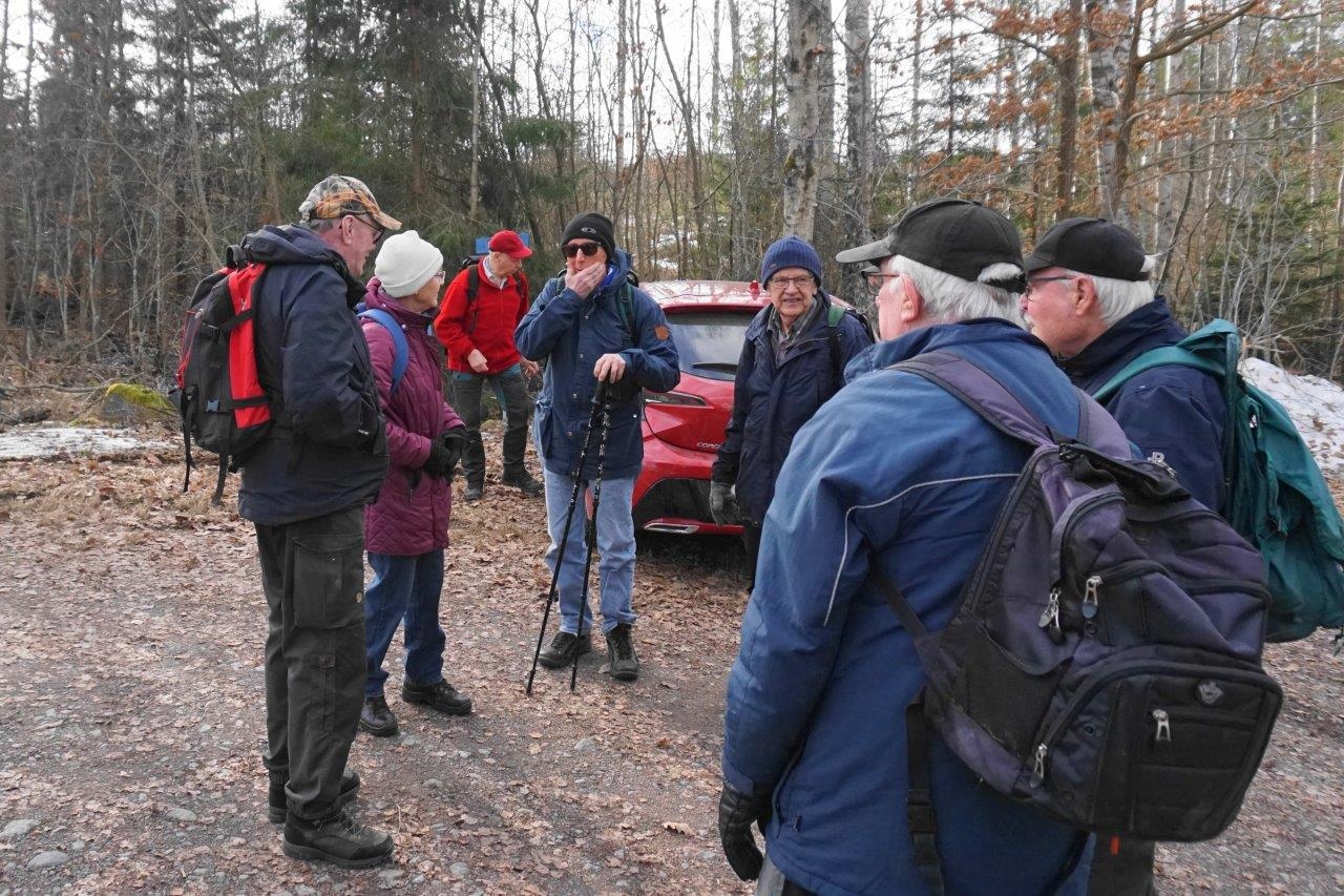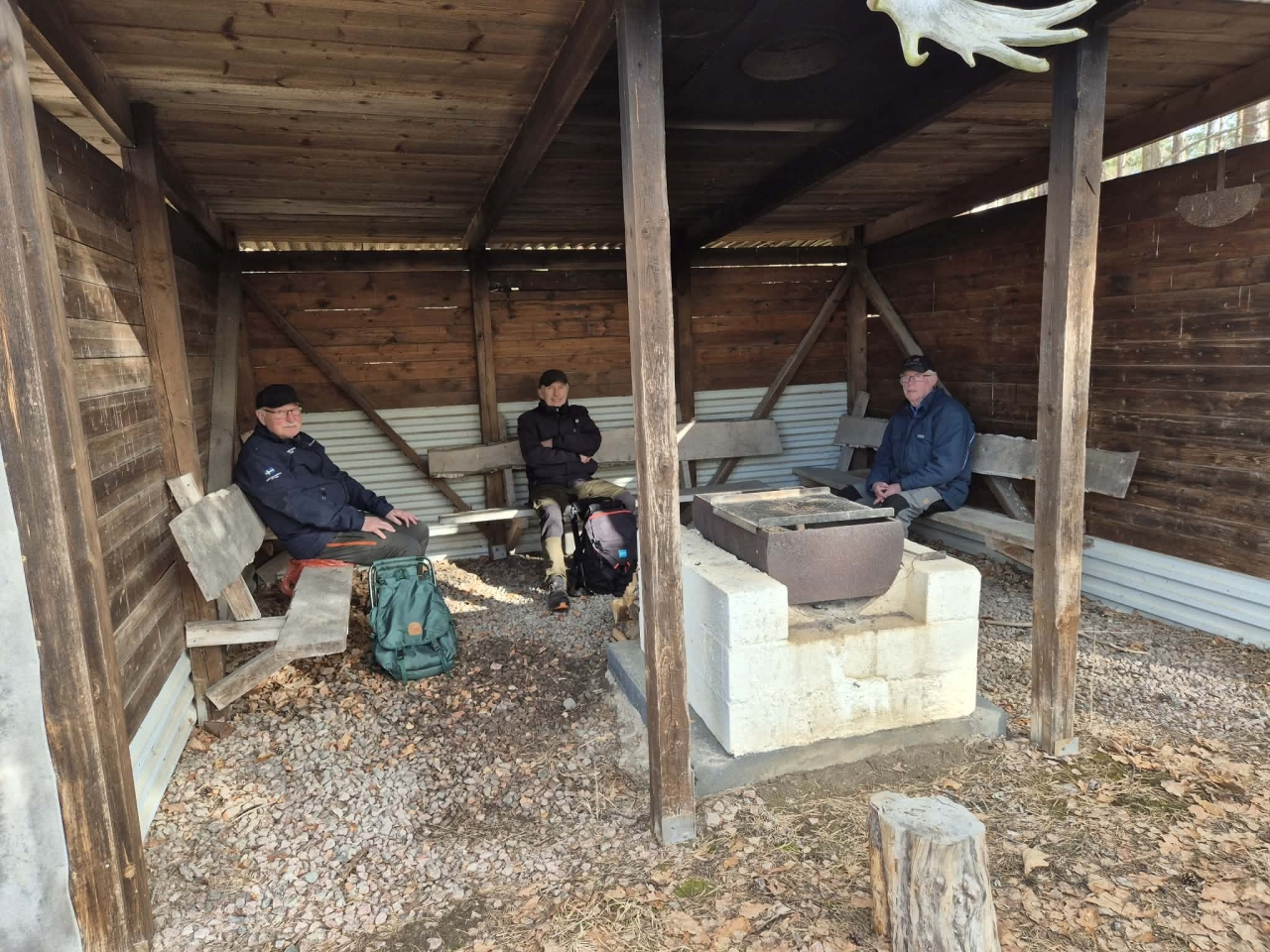 Vandring från Stora Hällesjön via Sälleryd, Isgölen och Möckhult. Soligt och 10 grader men lite kylig vind. 13 man på långa 8,6 km och 12 på korta 6,8 km (nytt längdrekord).