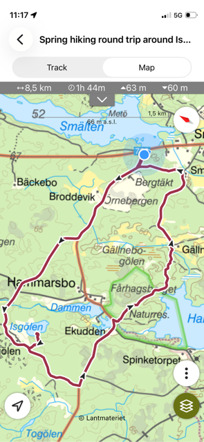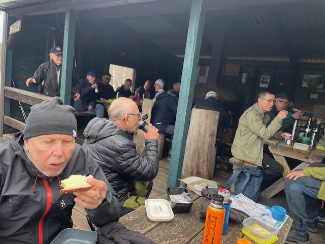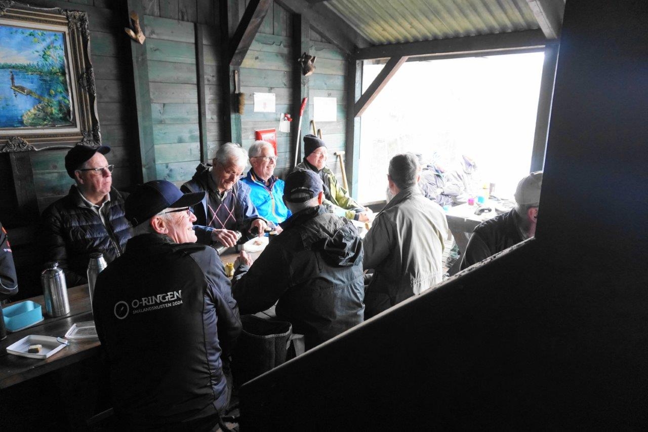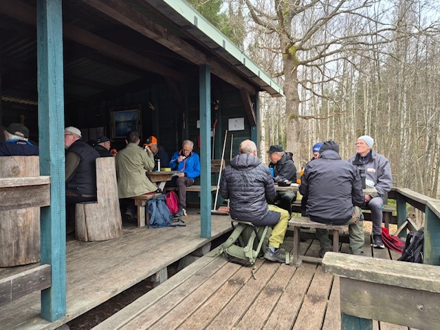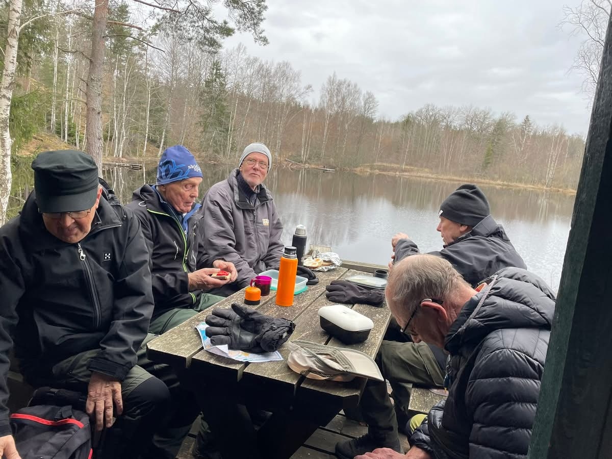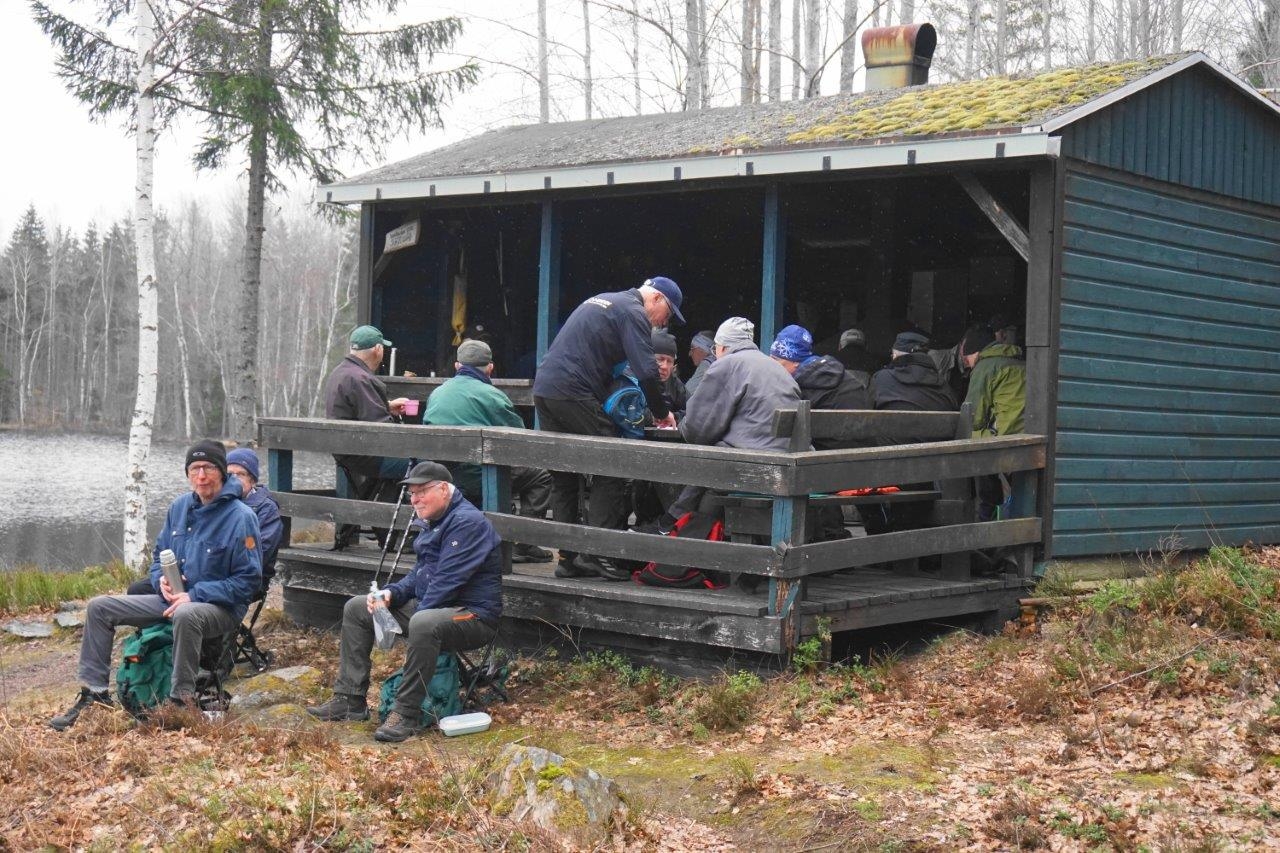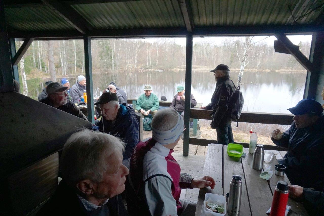 Vandring från Smältebro via fika vid Isgölens fiskecamp samt Gällnebo och Smältekvarn. Mulet och ett fåtal regnstänk, cirka 10 grader. Långa 8,5 km med 21 man och korta 5.2 km 9 man.