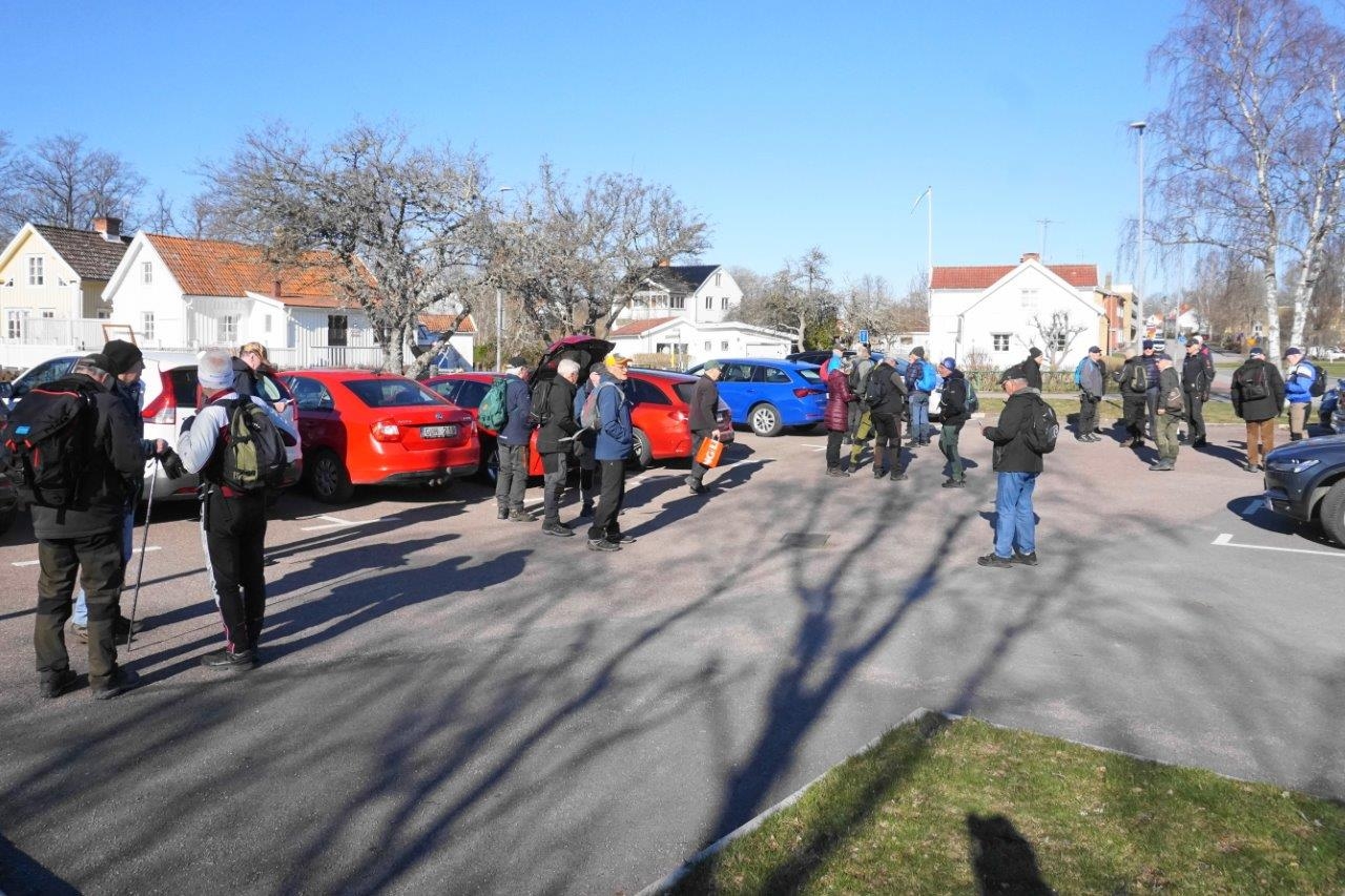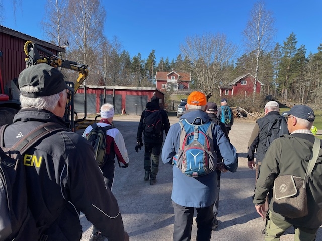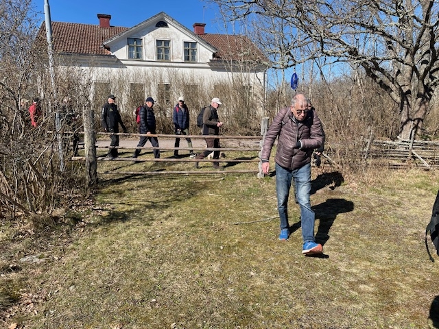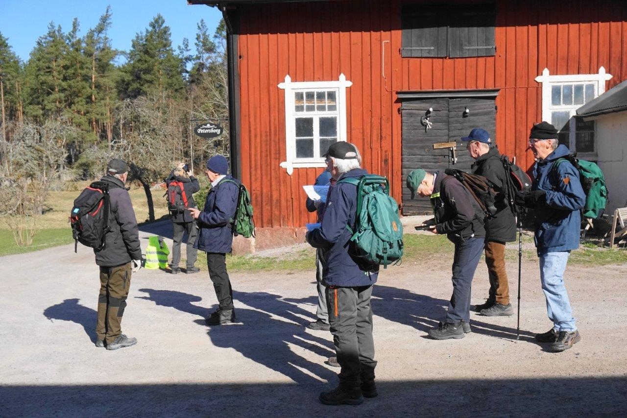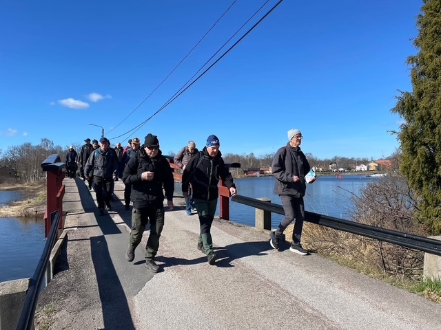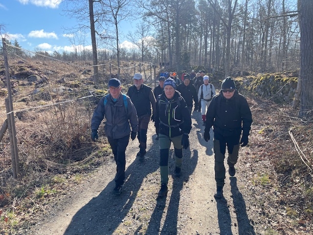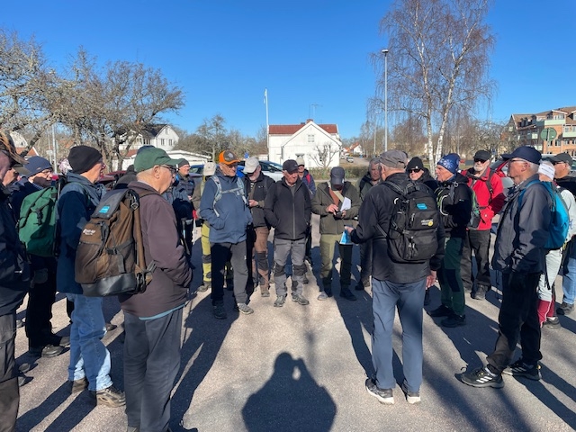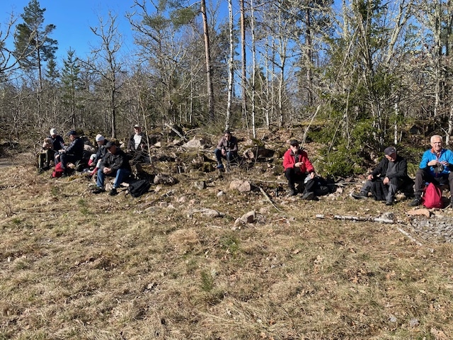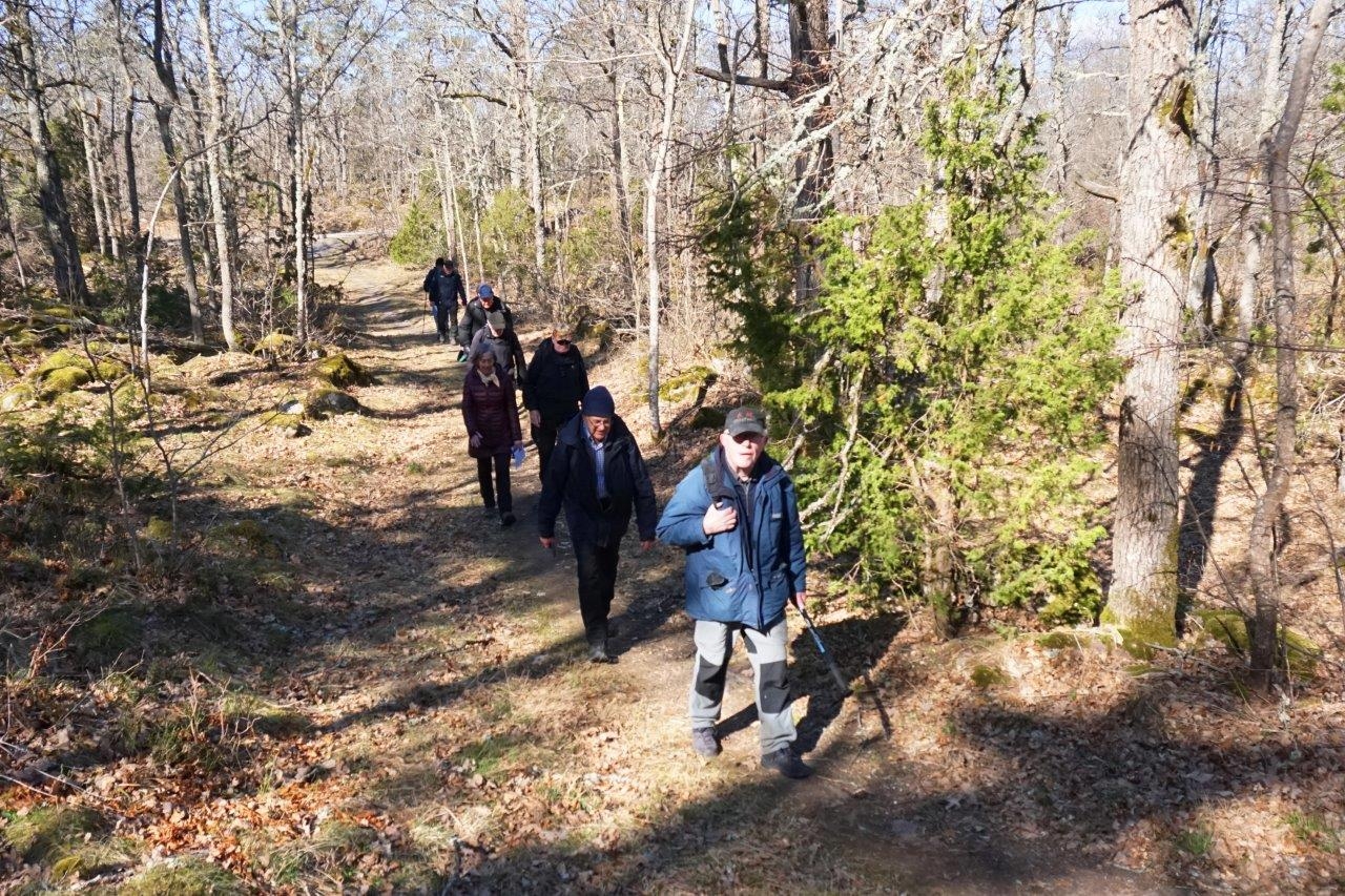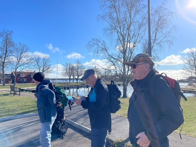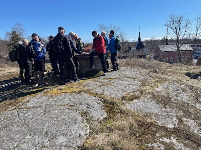 Solig men lite kylig vandring 5-7 grader. Start i hamnen i Figeholm och vandring till Petersberg, Stora Skaftvik, Äspö och Hembygdsgården. Långa 9 km med 23 vandrare och korta 5,7 km med 10 st.