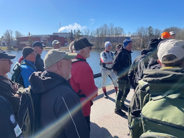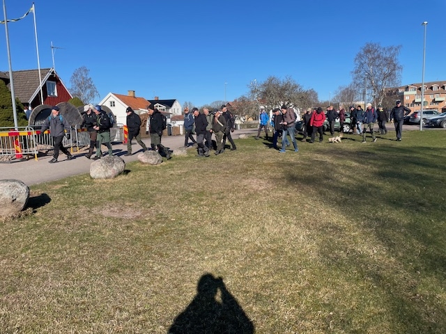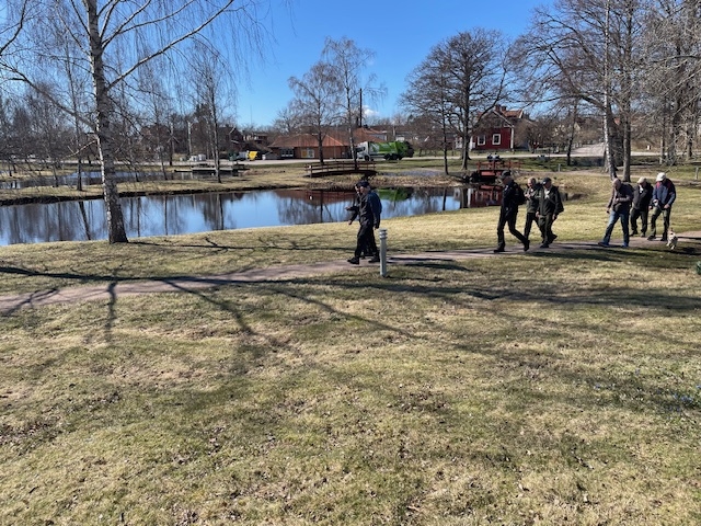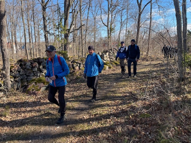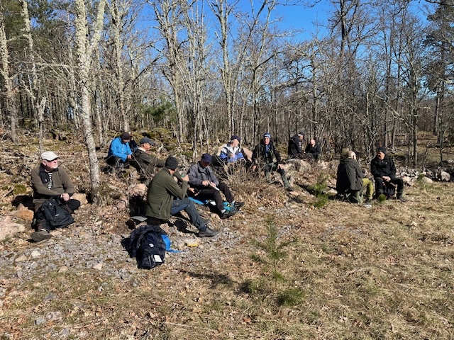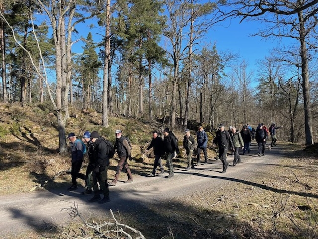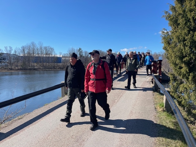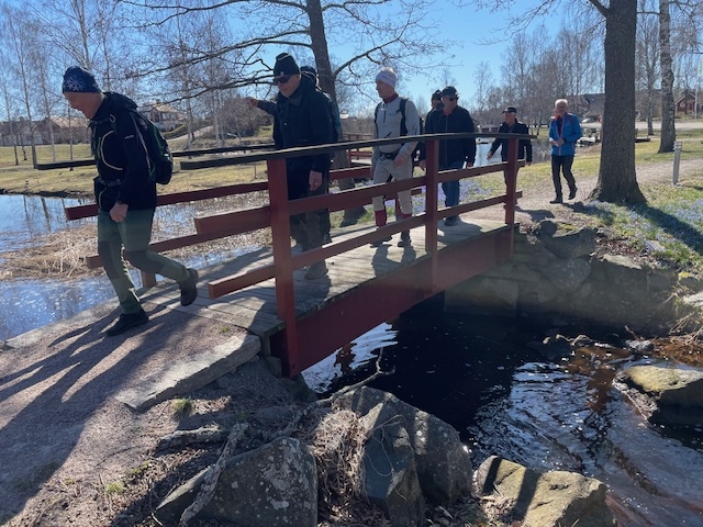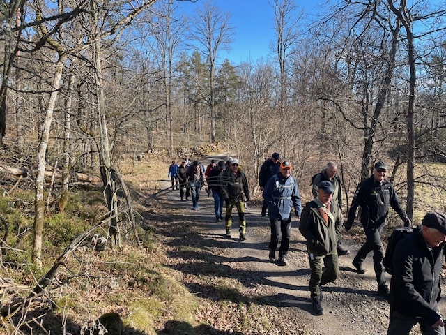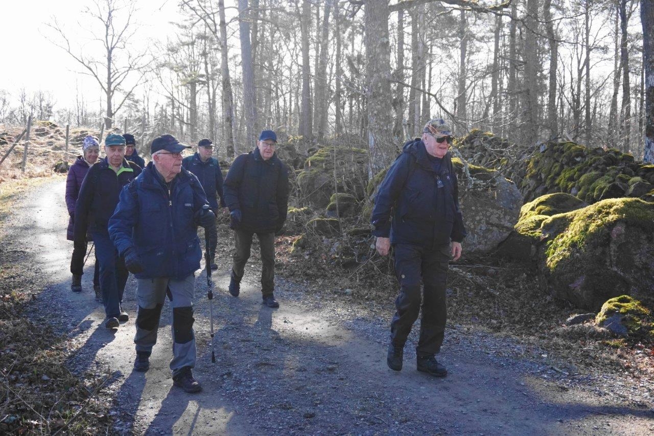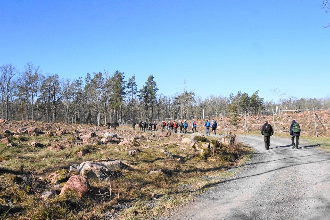 Solig men lite kylig vandring 5-7 grader. Start i hamnen i Figeholm och vandring till Petersberg, Stora Skaftvik, Äspö och Hembygdsgården. Långa 9 km med 23 vandrare och korta 5,7 km med 10 st.