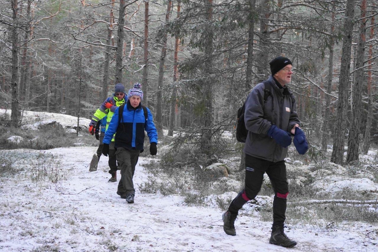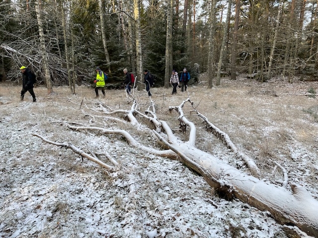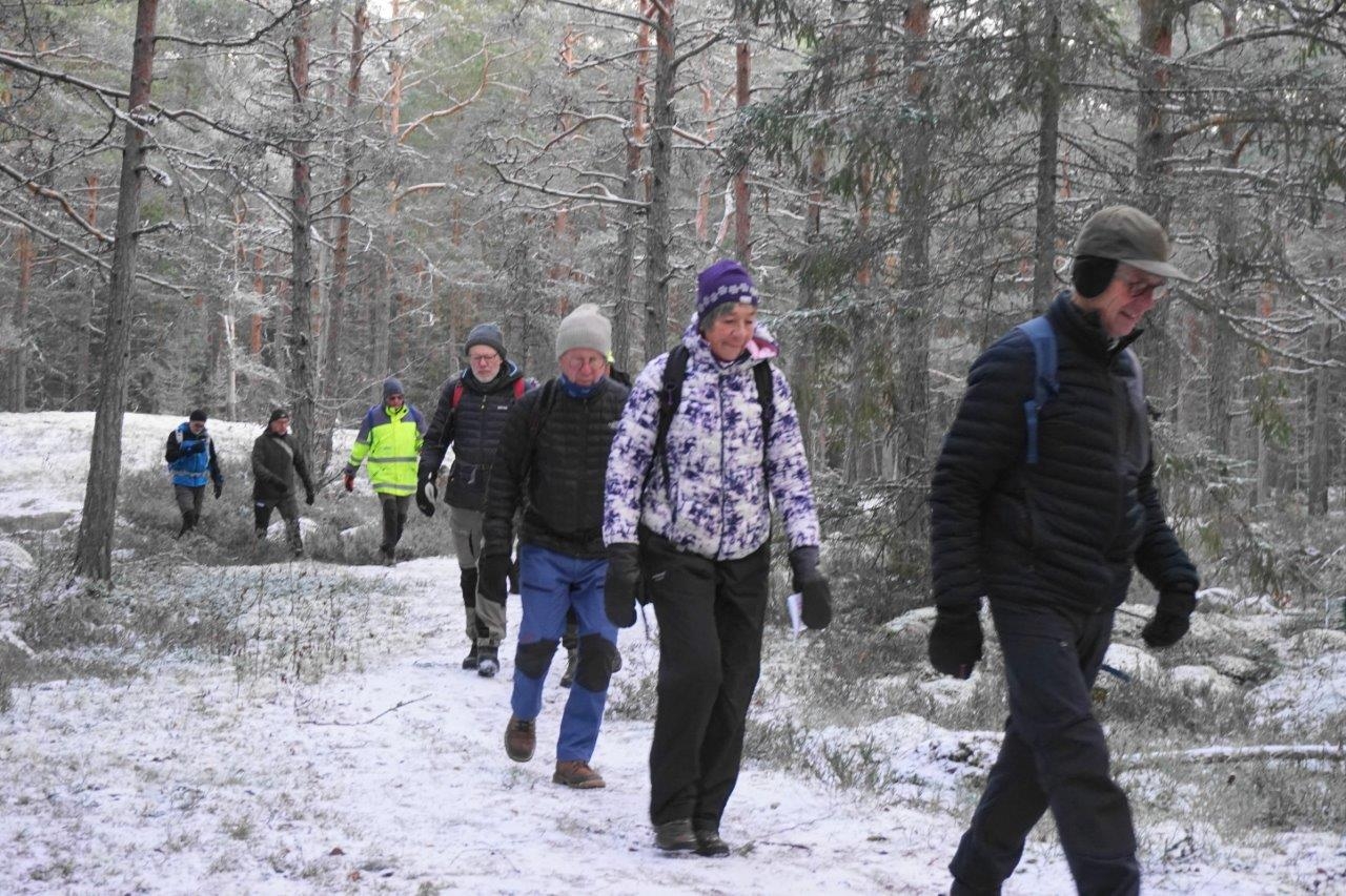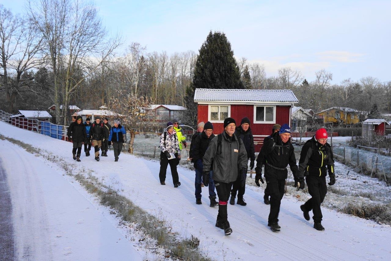 Vintervandring i Gunnarsöområdet med 15 vandrare på långa - 6,5 km och 6 vandrare på korta. Lätt pudersnö på marken och ett fåtal minusgrader.